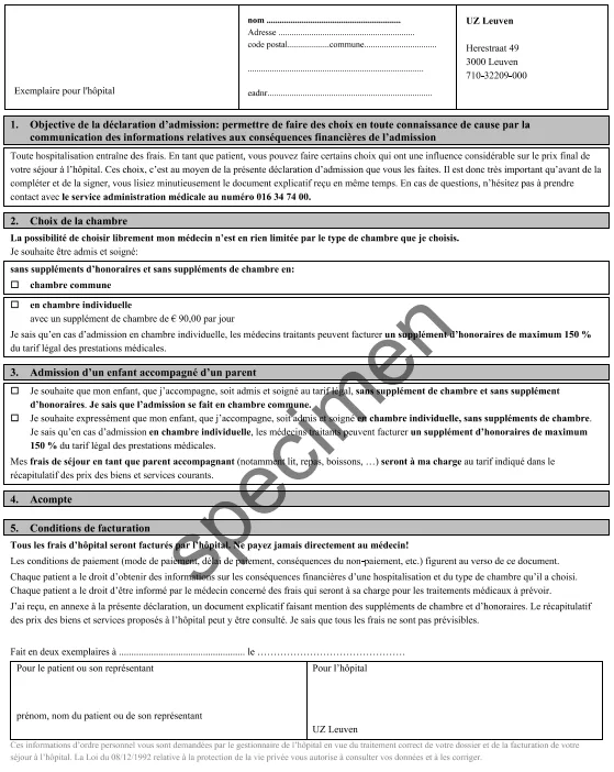 Przy przyjęciu do szpitala zwykle pojawia się dokument, w którym potwierdzasz warunki hospitalizacji, w tym wybór pokoju i możliwe dopłaty: déclaration d’admission po francusku / opnameverklaring po niderlandzku.